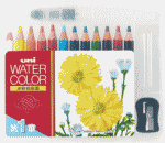 ユニ ウォーターカラー ぬり絵用コンパクトセット * セット内容 : 半木12色、水筆ペン1本、鉛筆キャップ1コ、ポケットシャープナー1コ |